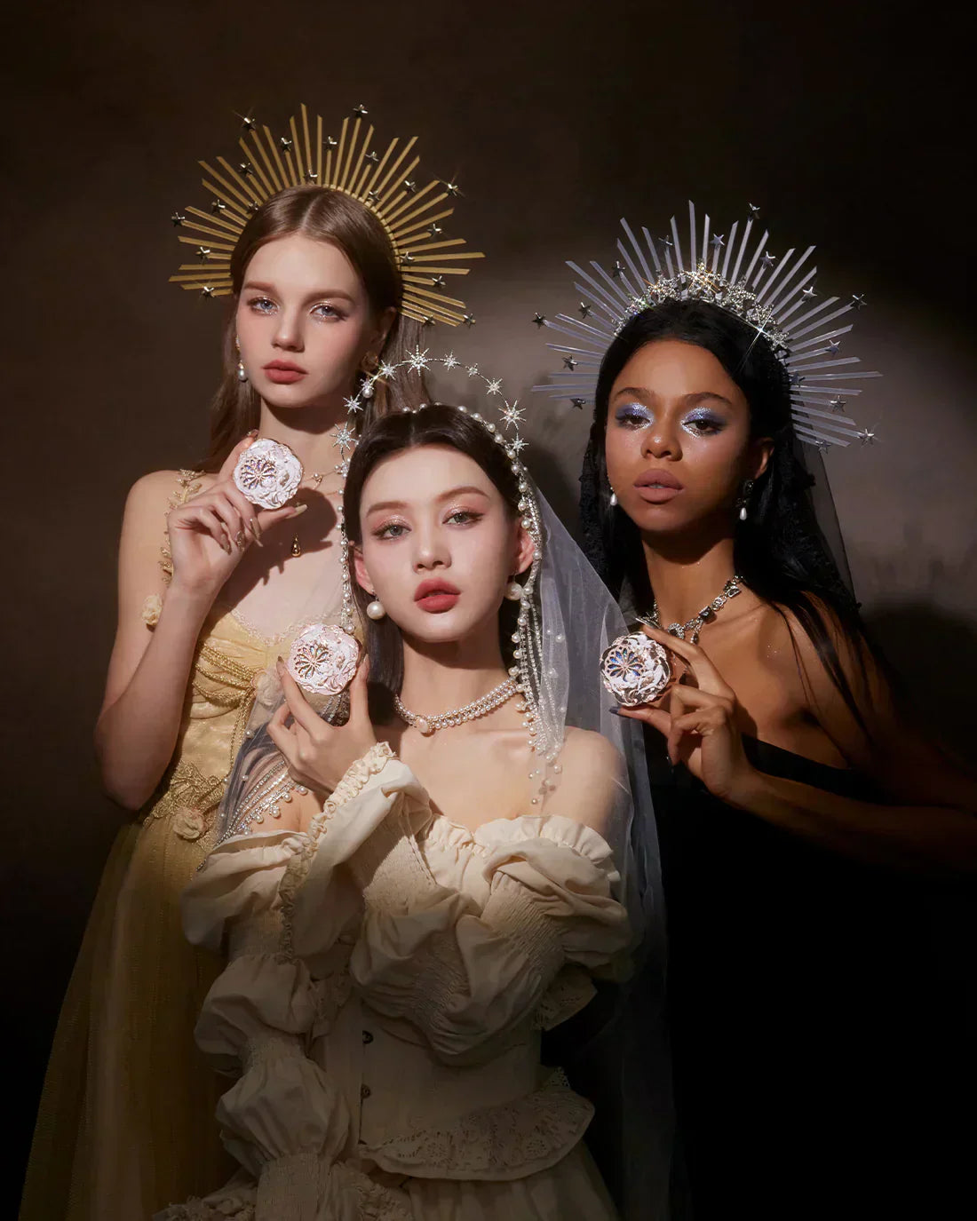 Inspired by the unique 'rose windows' of medieval architecture, our design features an asymmetrical style that represents a yearning for freedom and brightness. The lively, colorful stained glass window, surrounded by bas-relief angels, creates a fresh, angelic look.