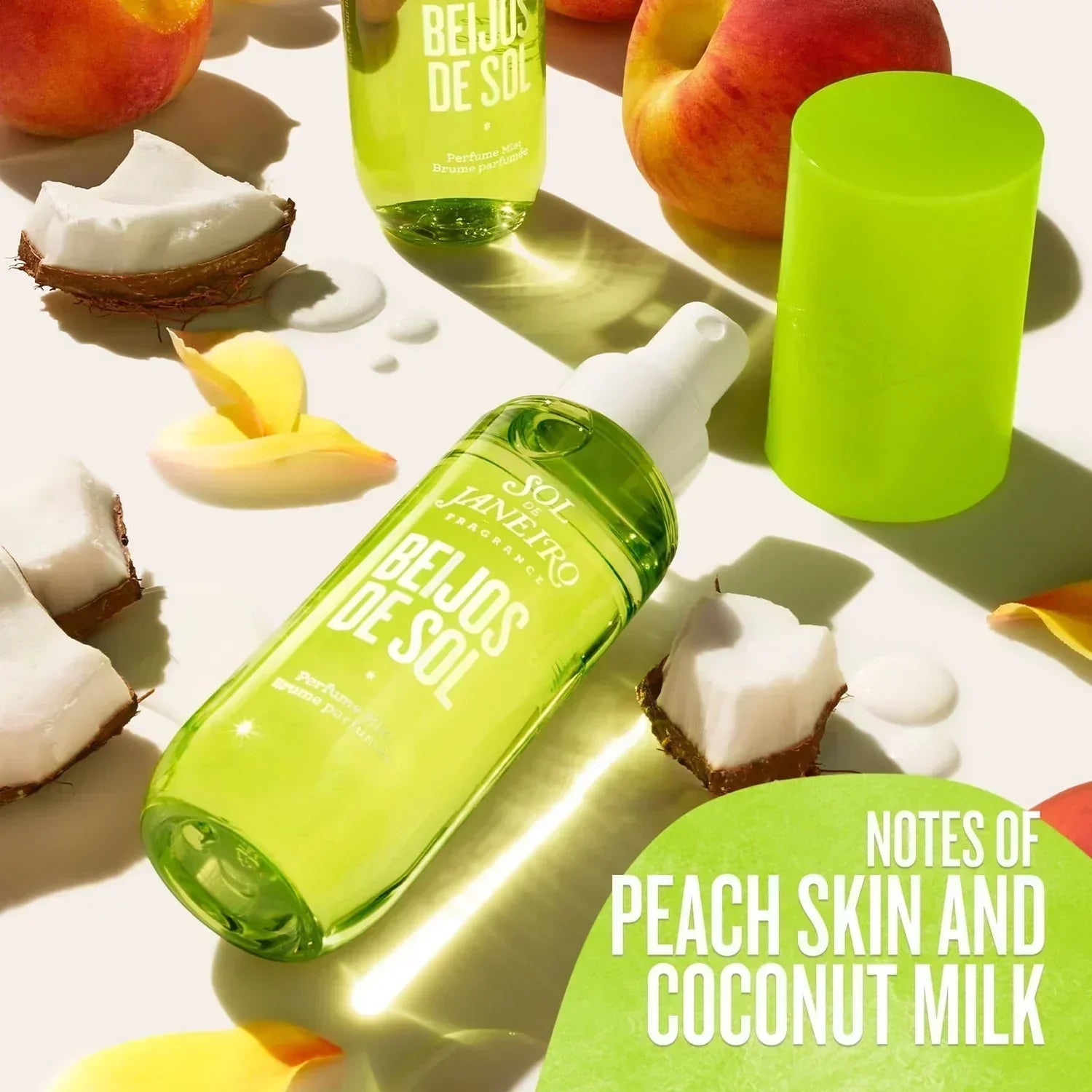 Beijos de Sol Perfume Mist is inspired by the joyful spirit of Copacabana Beach. Tropical and fresh, this tempting fragrance opens with a delightful burst of peach skin, while coconut milk and frangipani petals come together at the heart. Solar woods fill the air.